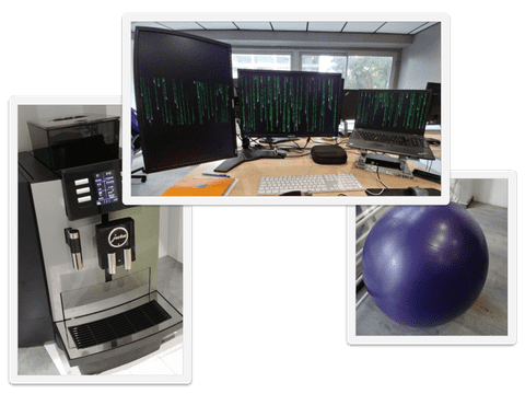 Le bon travail se fait avec les bons outils : on a des PC puissants et des postes de travail très modulaires et ergonomiques : assis, debout, sur une fitness ball …