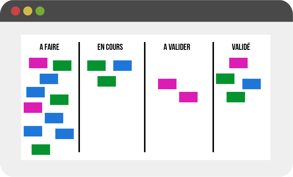 L’avancement du projet se déroule de gauche à droite, le but étant de finir avec tous les tickets dans la colonne la plus à droite, “Validé”.