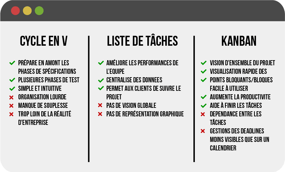 La liste de tâches et le système Kanban sont tous les deux issus des méthodes agiles et donc rythmés par des itérations jusqu’à la fin du projet.