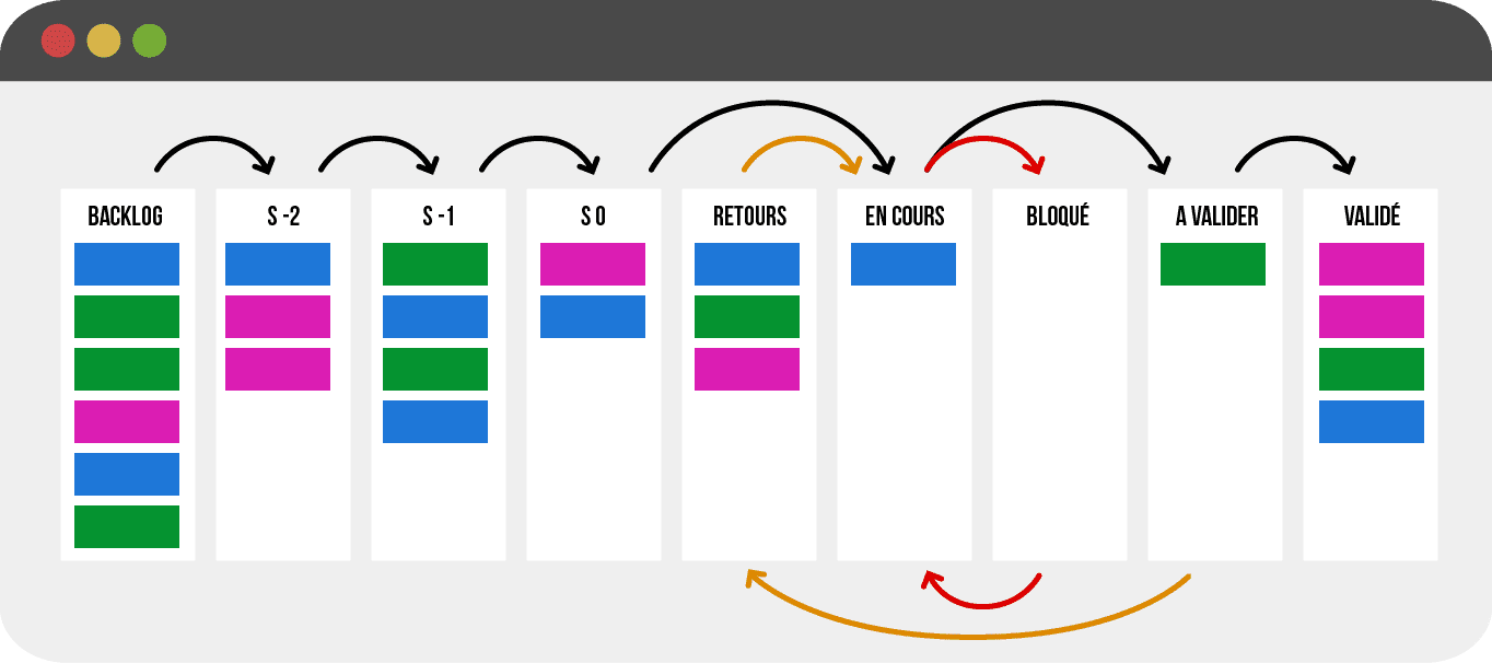 Lorsque l’on commence une tâche de l’itération 0 (S0) elle va dans la colonne “En cours” et une fois finie dans “A valider”. Quand la tâche est validée par le chef de projet et/ou client la tâche est finie et peut aller dans la colonne “Validé”. Pour l’instant, nous ne déployons pas encore, mais une colonne “Déployé” pourra être ajoutée ensuite. Si la tâche n’est pas validée, la raison est notée dans le ticket et elle va dans la colonne “Retours”. Les retours sont prioritaires sur les tâches de l’itération en cours (cycle orange sur le schéma) comme on peut le voir dans l’ordre des colonnes.