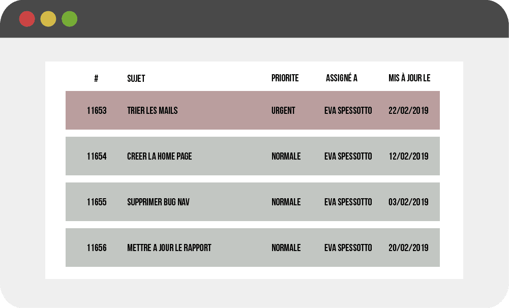 La liste de tâche est gérée par un système de tickets dans lequel un ticket représente une tâche. Ils sont triés par priorité décroissante et par itération. Chaque ticket est attribué à une personne pour qu’il apparaisse dans sa liste de tâche à faire.