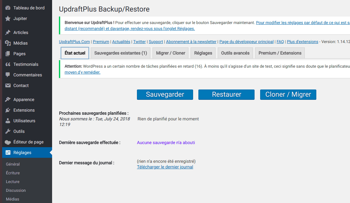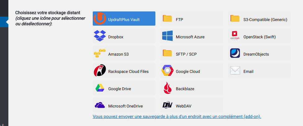 Updraft Plus est simple d'utlisation et présente notamment l'avantage de pouvoir définir des sauvegardes planifiées enregistrées envoyées vers Dropbox, Google Drive, Amazon S3 (ou compatible), UpdraftVault, Cloud , DreamObjects, FTP, Openstack Swift et e-mail.